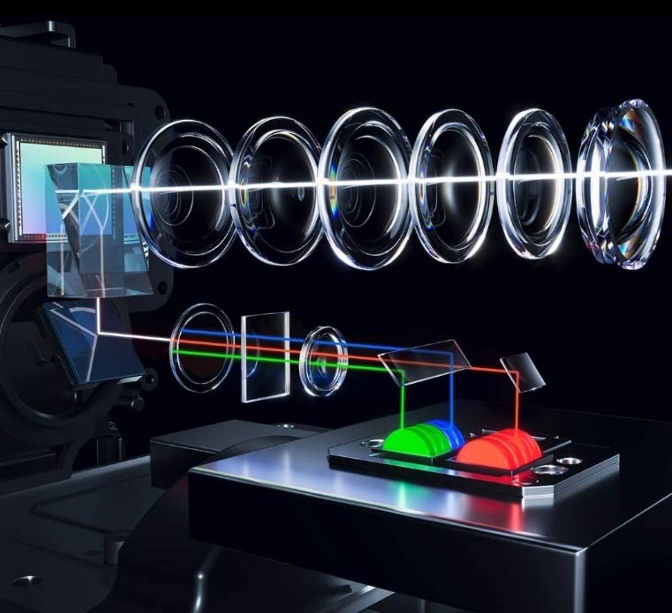 Három lézer (RGB lézer van benne fényforrásként. A hagyományos projektorokban, vagy tévéknél gyakran egyetlen fehér fényt szűrnek különböző színekké, vagy lézerprojektoroknál egyetlen lézert széthasítanak színszűrőkkel.