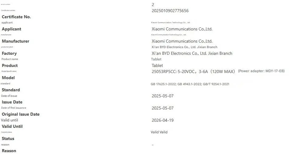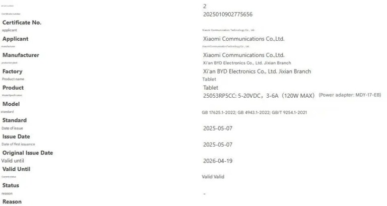 Ez a tablet május 7.-én csendben átesett a kínai 3C tanúsításon a 25053RP5CC azonosítóval és egy olyan adatot mutatott, ami azonnal kiemelkedik és ez a 120W-os vezetékes töltés.