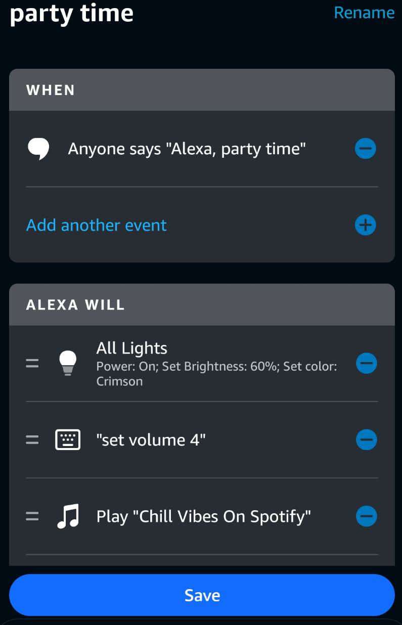 Rutinokat is készíthetsz, amelyek arra jók, hogy automatizálj több feladatot egyetlen parancsra, vagy egy előre beállított eseményre (pl. időpontra vagy érzékelő aktiválódására) és lehetővé teszik, hogy egyetlen hangparanccsal (például: “Alexa, reggel!”) több dolgot indíts el egyszerre.
