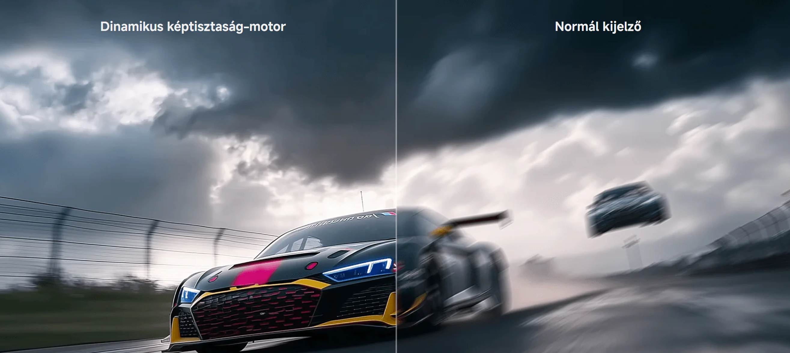 A dinamikus képtisztaság‑motor mozgáselemzéssel és proaktív képkocka‑beillesztéssel próbálja stabilizálni a gyors objektumokat, miközben a frissített háttérvilágítás‑vezérlés csökkenti a szellemképet, villódzást és a zavaró fényudvart.