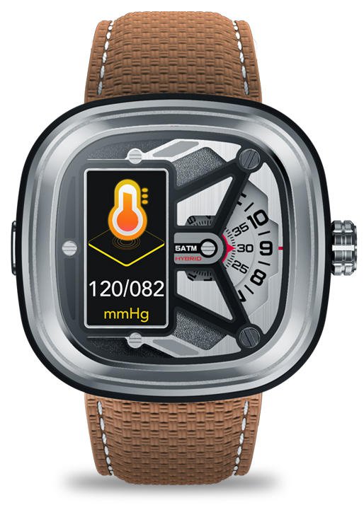 Egy érdekes dizájnt álmodott meg a gyártó, amely áll egy mechanikus részből és egy 0.96″ méretű kijelzőből. Vagyis a kijelző lényegében okoskarkötő méretű, szóval annyira azért nem kicsi. A mechanikus rész nem mutatós, hanem tárcsák forgatásával mutatja az időt.